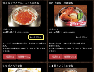 メニュー一覧の中からご注文したい商品をお選びいただき、ご注文商品が決まりましたら、「詳しくはこちら」をクリックしていただくと、商品詳細ページへ遷移します。