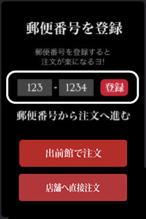 郵便番号をご入力後、出前館をご利用の方は、「出前館」のボタンをクリックし、出前館のご注文ページで注文手続きを行ってください。